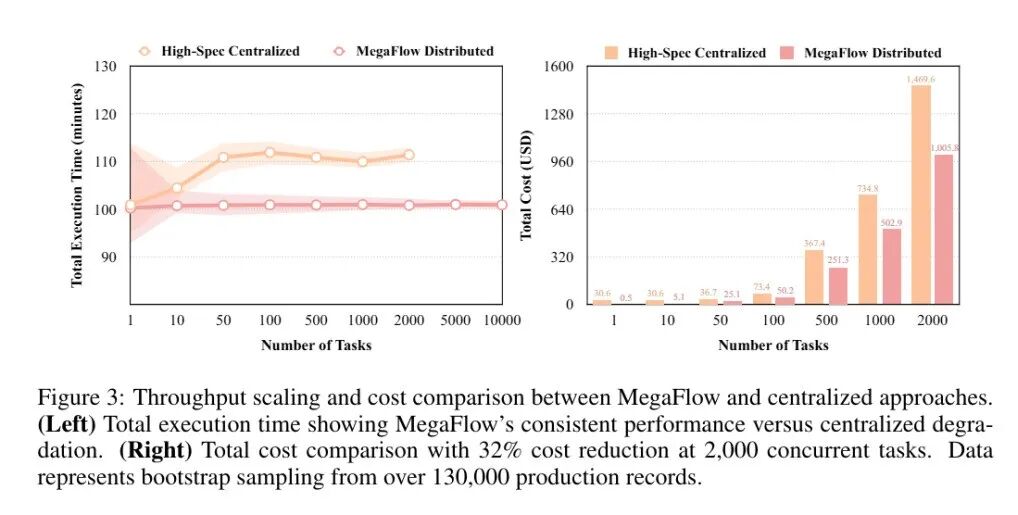 在处理2,000个任务时,MegaFlow实现了32%的成本降低(1,005美元对比1,470美元),且规模越大成本优势越显著。除直接节约成本外,MegaFlow还消除了传统方法因资源可用性限制而无法扩展至大规模工作负载的瓶颈。