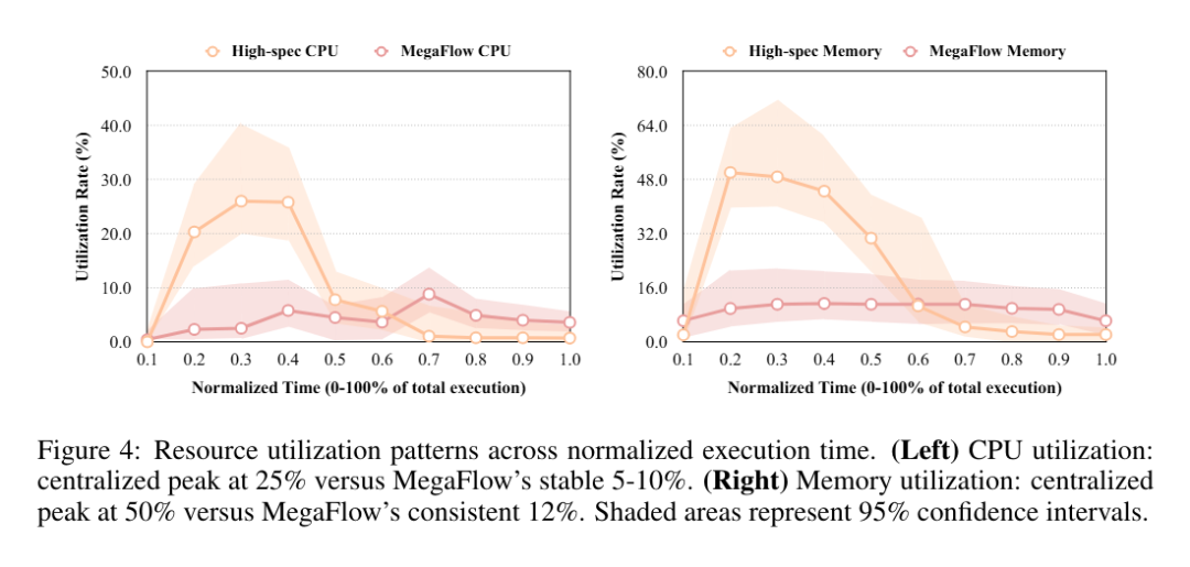 MegaFlow 稳定的资源利用模式配合较窄的置信区间,体现出可预测的资源消耗行为,从而支持更高效的容量规划与资源分配。虽然单个实例的峰值利用率较低,但分布式模型通过在整个执行生命周期中保持一致的资源使用,实现了更优的整体资源效率。