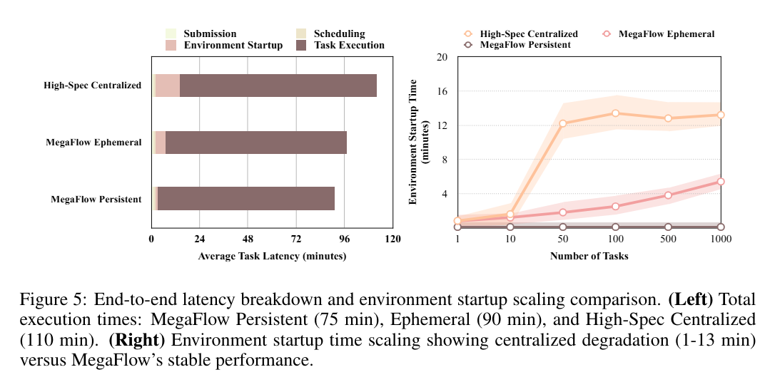 环境启动时间展现了执行策略间关键可扩展性差异。高规格集中式方法的启动时间严重衰减:由于容器镜像拉取和初始化阶段的资源争用,单任务时仅需1分钟,但在1,000个并发任务下激增至13分钟。相比之下,MegaFlow 的临时执行模式启动时间仅从1分钟增长至6分钟,而持久执行通过环境复用,在所有并发级别下均保持低于1分钟的稳定低启动时间。