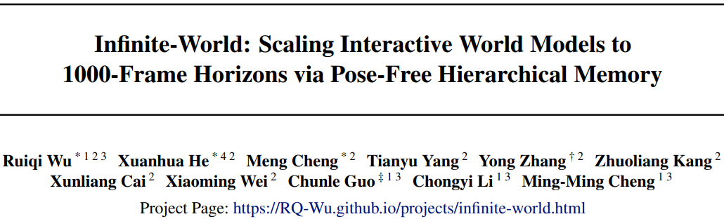论文标题:Infinite-World: Scaling Interactive World Models to 1000-Frame Horizons via Pose-Free Hierarchical Memory