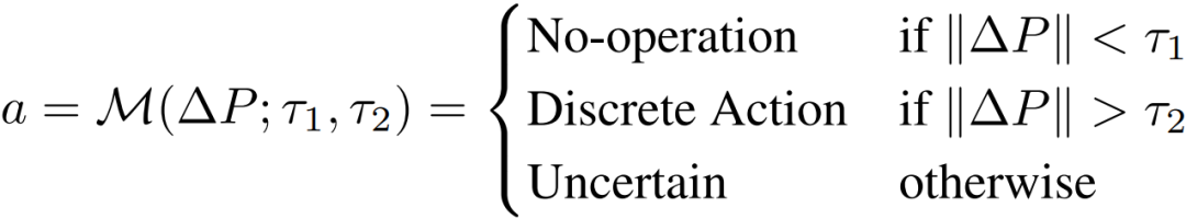 研究先将位姿变化解耦为平移、旋转幅值,通过 (噪声阈值)、 (动作触发阈值)两个阈值设计三态逻辑为运动分配动作标签,分为无操作、离散动作、不确定三类。针对平移、旋转任一维度,动作标签 的分配规则如下: