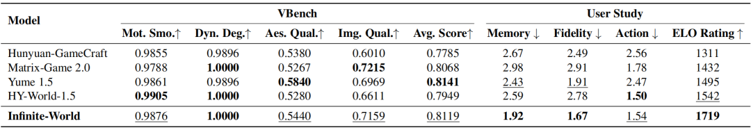 研究团队将 Infinite-World 模型与多款前沿交互式世界模型展开性能对比,如表 1 所示,Infinite-World 模型在 VBench 评测体系的所有维度上均取得最优或次优性能。