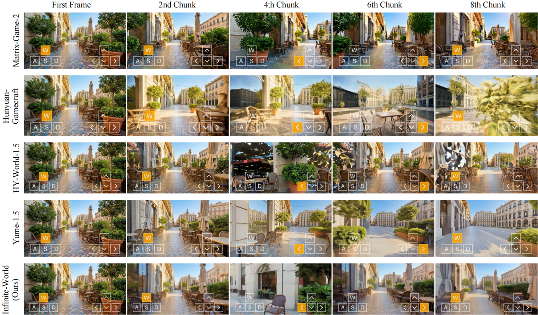 Infinite-World 通过不确定性感知动作标注克服了上述各类问题,实现了响应性动作控制,其在数百帧后仍能保留场景全局地标,成功完成各基线模型均无法实现的长距离闭环,也验证了层级化记忆压缩模块能有效激活模型的空间推理能力。