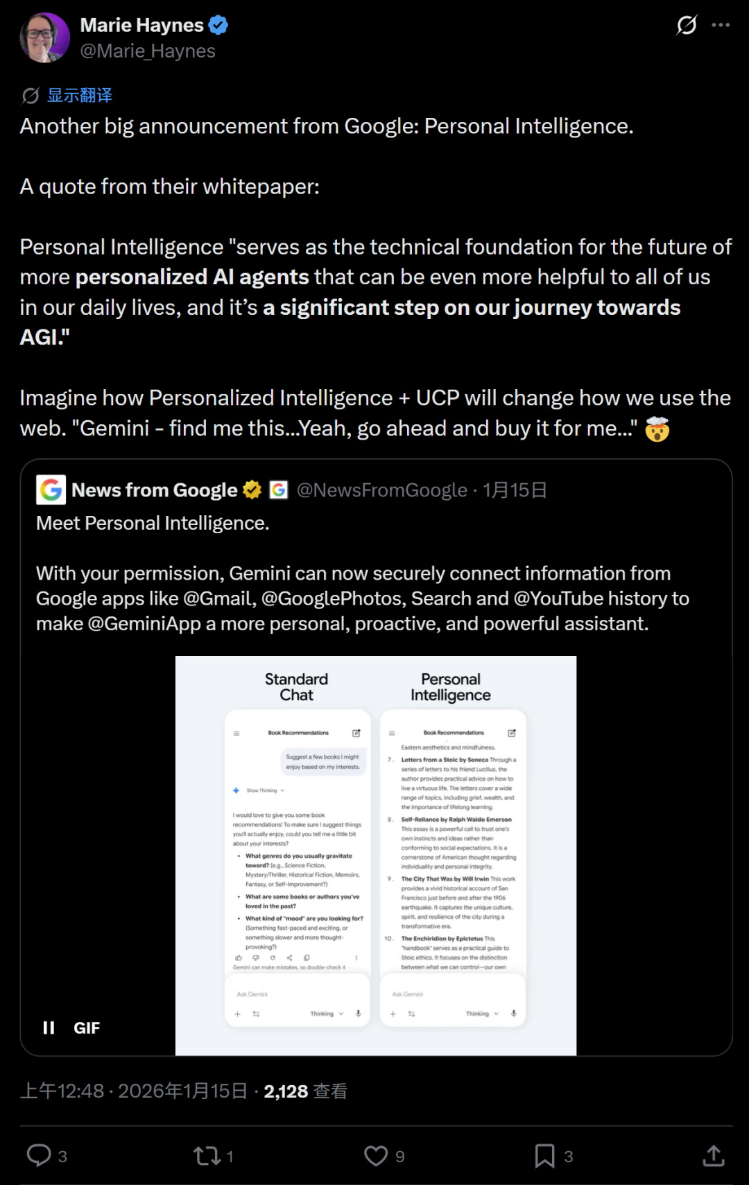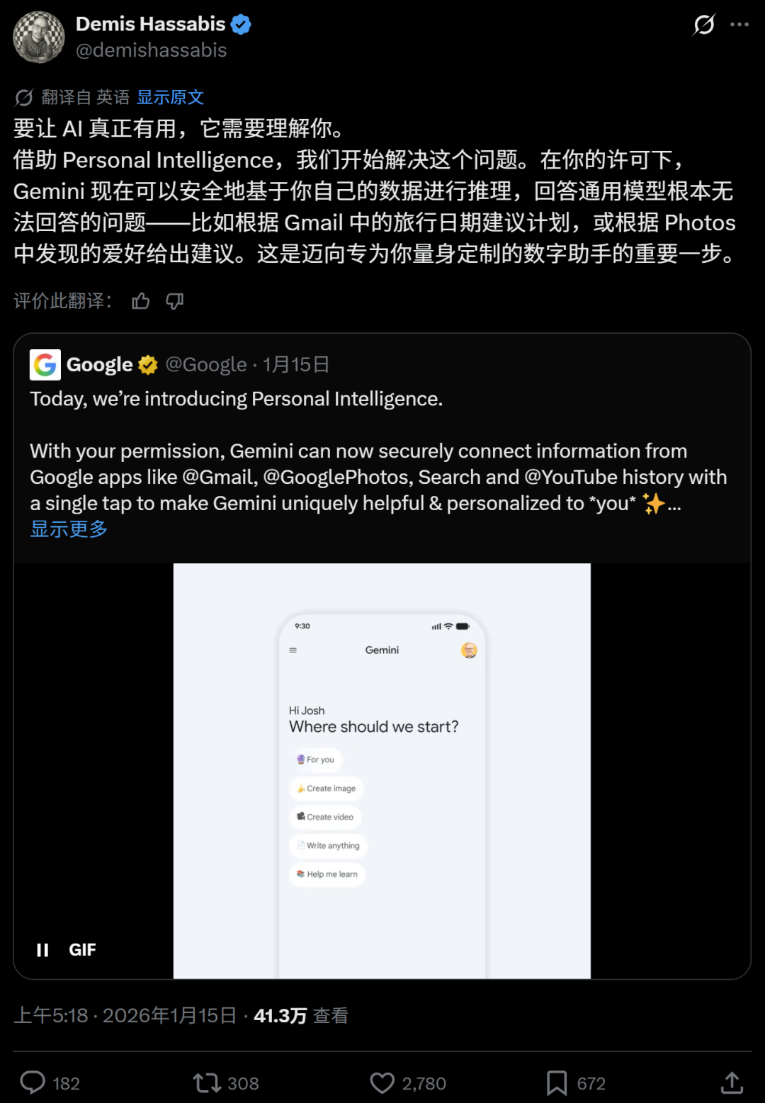 Personal Intelligence“作为未来更个性化AI智能体的技术基础,这些将能在我们的日常生活中为我们所有人提供更大的帮助,这是我们通往AGI之旅中的一个重要步骤。”