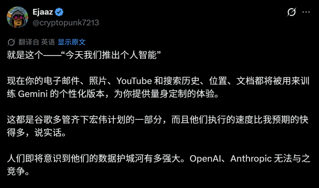 前Coinbase和ConsenSys员工,AI与加密货币专家Ejaaz发帖,将Google与OpenAI和Anthropic作比较,表示数据也是AI时代的重要因素,“Google通过整合用户邮件、照片、YouTube和搜索历史来训练个性化Gemini,这是数据护城河的强大体现,OpenAI和Anthropic难以竞争”。
