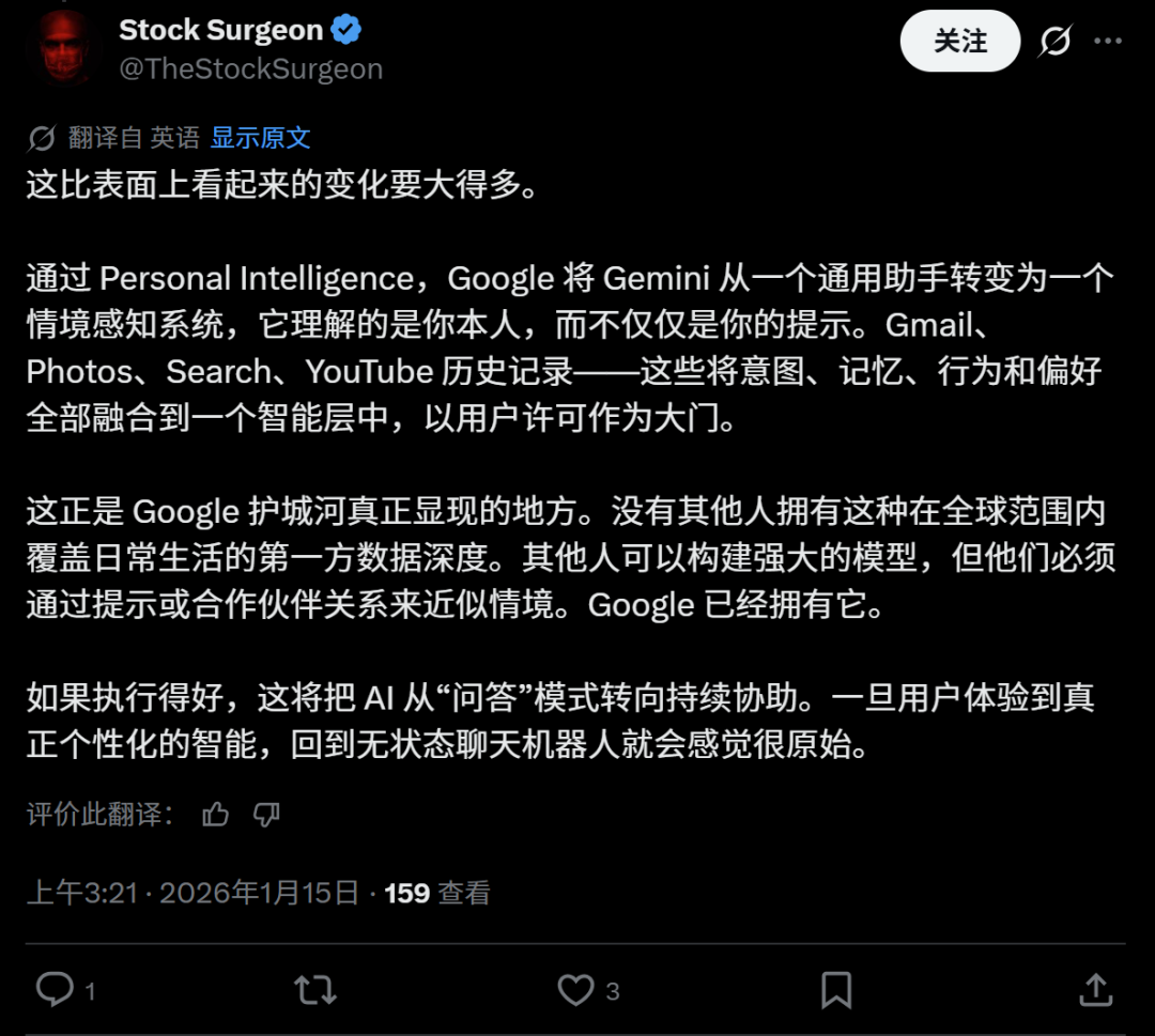 Gemini的Personal Intelligence更新,看似低调,却直击AI应用的痛点。简单说,过去AI仅基于提示词响应;现在它能基于用户的多方面个人数据作出回答,比如,从邮件中提取旅行计划,再结合照片兴趣和搜索偏好,并提供个性化建议。