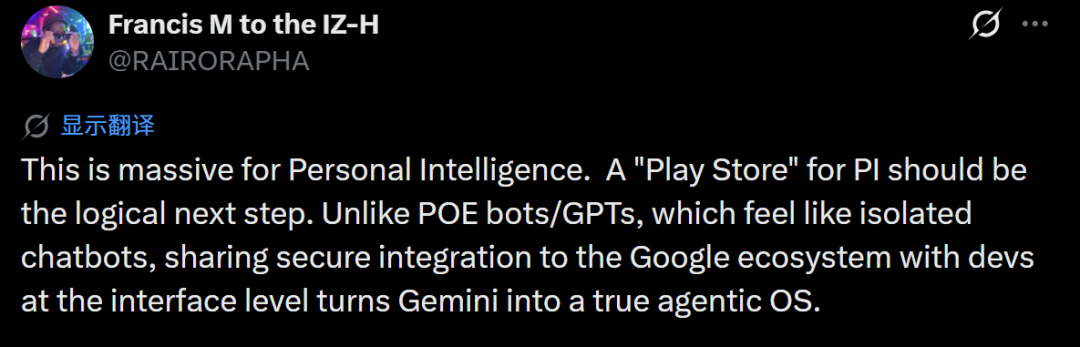 Sozofix构建者称,这对个人智能来说意义重大。PI的“Play 商店”应该是合乎逻辑的下一步。与感觉像是孤立聊天机器人的POE机器人/GPTs不同,在接口层面与开发者共享对Google生态系统的安全集成,将Gemini转变为真正的智能体操作系统。