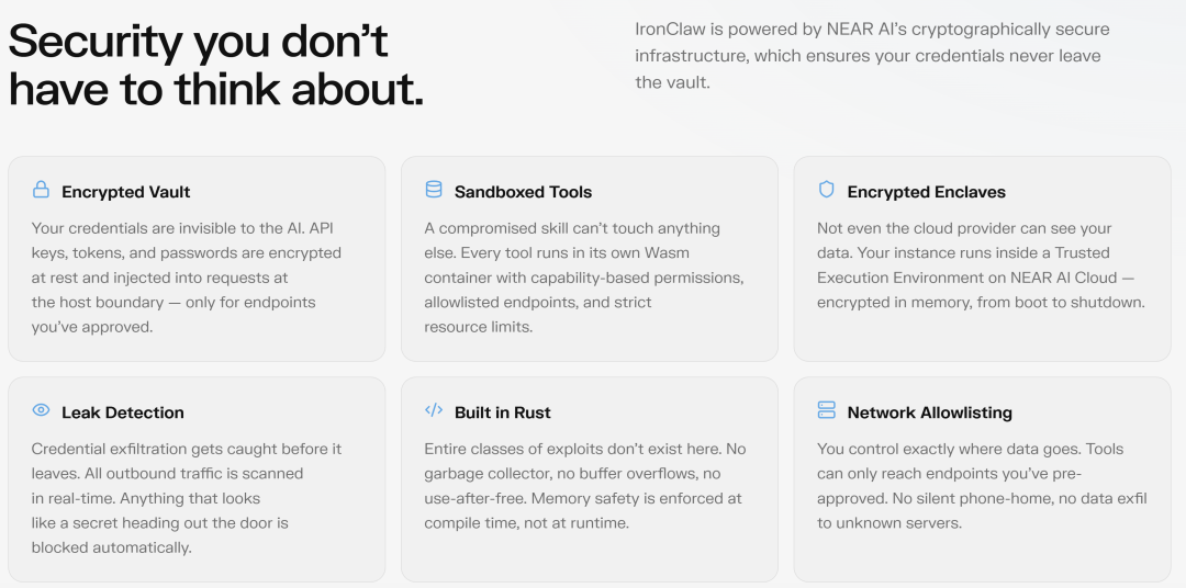 这几天阿里云的HiClaw开源,以及IronClaw的出现,就像给整个Claw赛道敲响了一记警钟。强大功能必须建立在可验证、可审计的安全之上。Illia Polosukhin和NEAR AI团队用Rust + WASM + TEE的硬核组合证明,用户拥有的AI,不只是“能干活”,更应该是“干活不泄密、不失控、不被利用”。