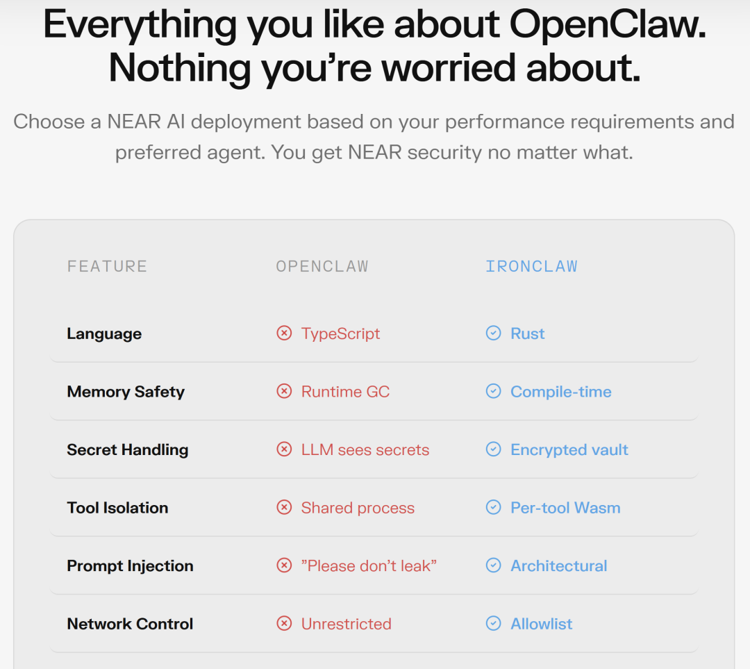 就在大家对AI代理的安全性产生严重质疑时,Transformer论文共同作者、NEAR Protocol联合创始人Illia Polosukhin站了出来。他直言:“人们在使用OpenClaw时丢失资金和凭证的情况太多了。”于是,NEAR AI团队从零开始,用Rust语言重写了一个安全优先的版本,IronClaw(铁爪),该项目完全开源。