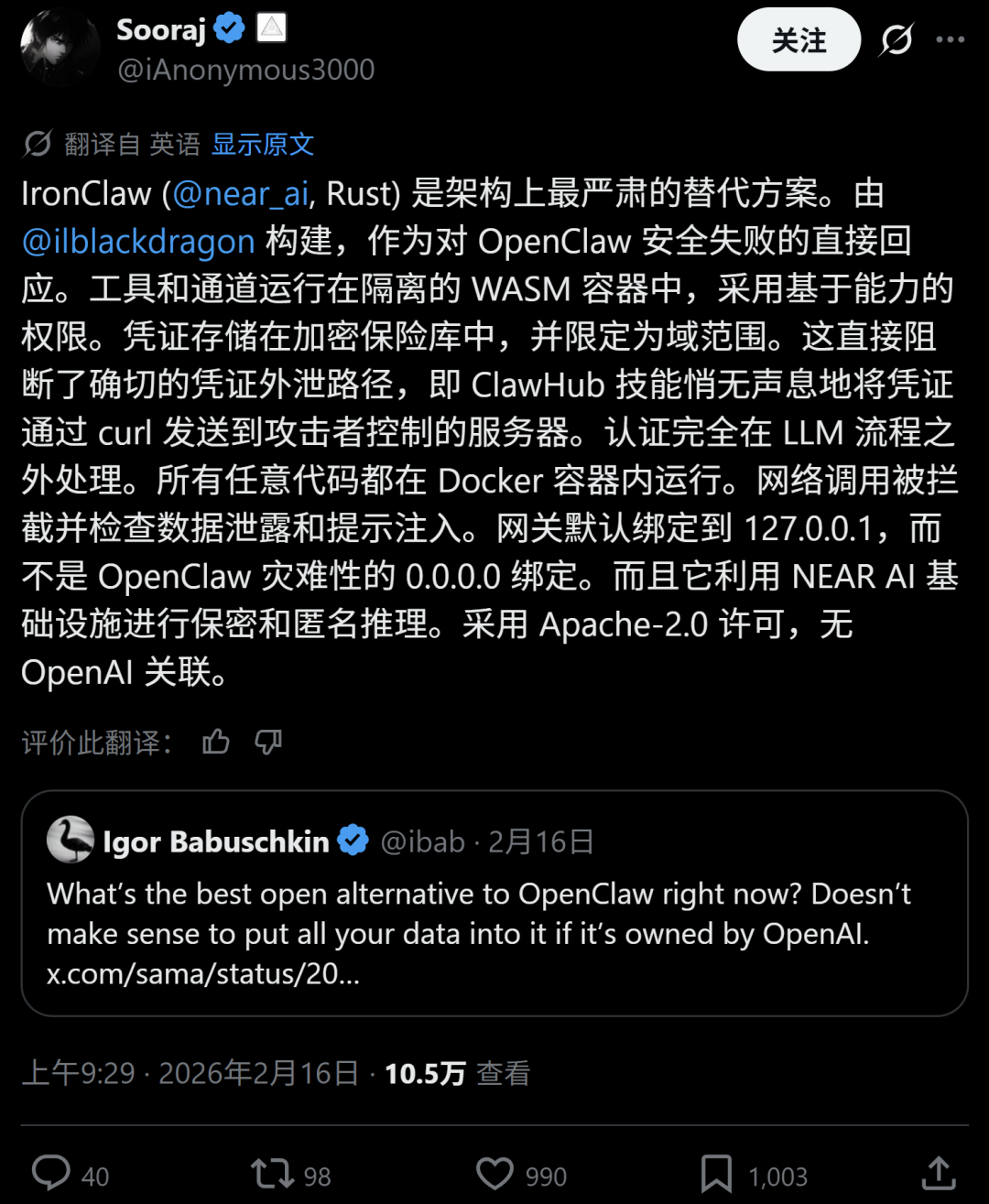 Brave浏览器相关开发者Sooraj发帖,极力赞扬,称“IronClaw是架构上最严肃的替代方案”,这是对OpenClaw安全方面的失败的直接回应。