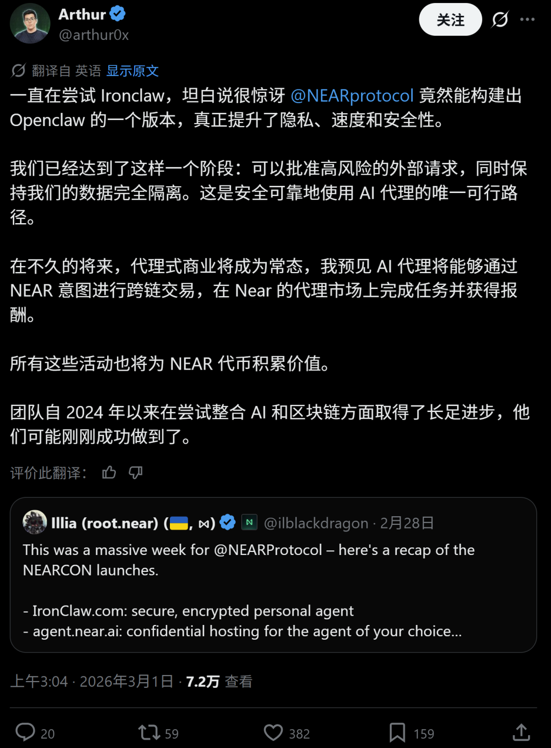 DeFiance Capital CEO & CIO,20多万粉的知名加密投资人Arthur在持续体验IronClaw后表发出了非常惊喜的情绪,他说NEAR AI在隐私、速度、安全方面都超越了OpenClaw,现在用户可以允许高风险的外部请求,同时还能隔离数据,这是安全使用AI智能体的唯一可行路径。
