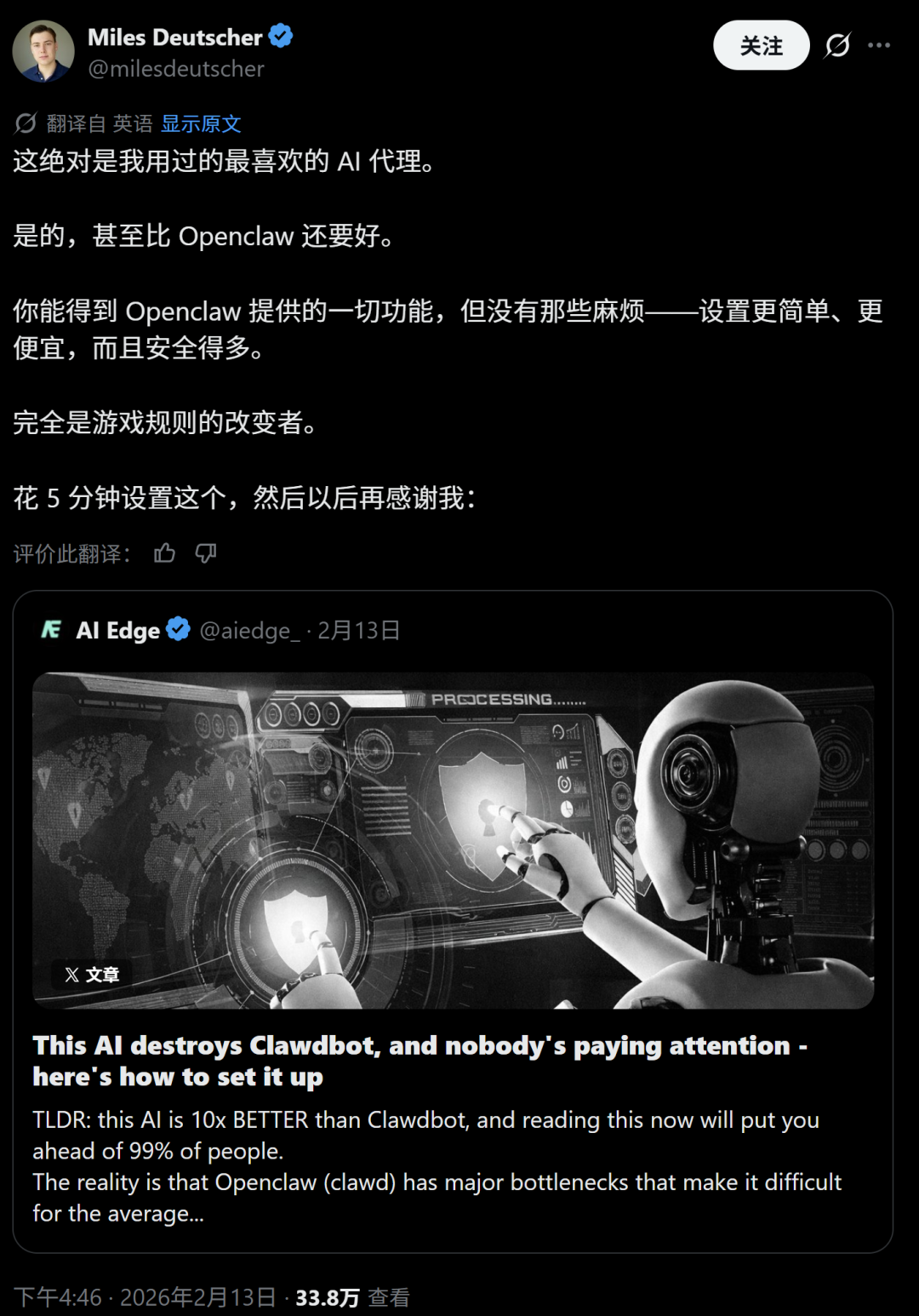 知名AI内容创作者,AIE dge创始人、65万粉大博主Miles Deutscher亲身体验后发帖,表示这可比OpenClaw更好,因为它设置更容易、更便宜、而且安全得多。