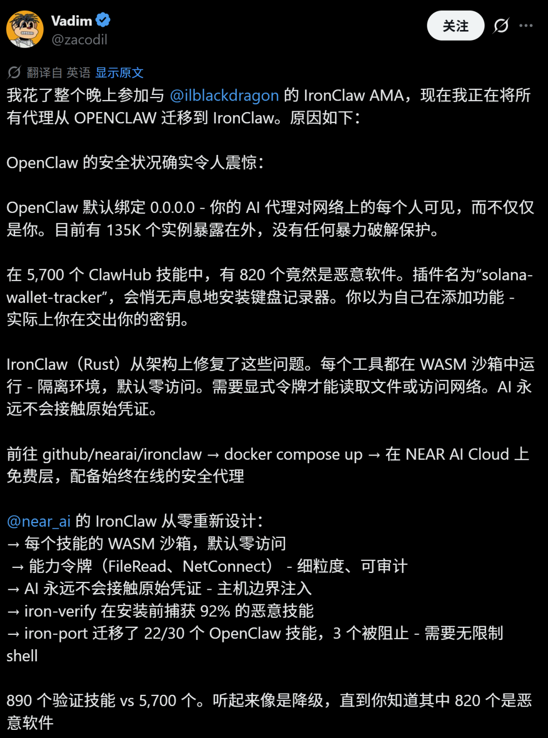 前NEAR核心开发者,现Outlayer构建者Vadim表示针对安全问题发帖,表示OpenClaw的安全状况确实非常令人震惊,同时5700个ClawHub skills中,有820个都是恶意的,会引导AI交出你的密钥。而IronClaw则从架构上修复了这些问题,AI永远不会接触原始凭证。