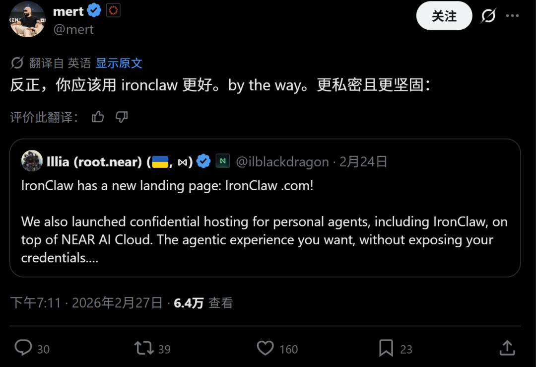 Helius CEO,Solana基础设施专家mert也发帖表达了支持,表示IronClaw更私密更牢靠。