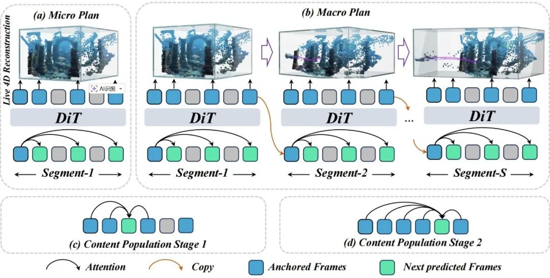 通过分层链接片段,宏规划将逐帧的自回归依赖关系转换为稀疏的片段级规划步骤序列。随后,通过对跨片段的锚定关键帧进行在线四维重建,将这些记忆锚定在一个连贯的时空场内,从而将所有关键帧嵌入其中。
