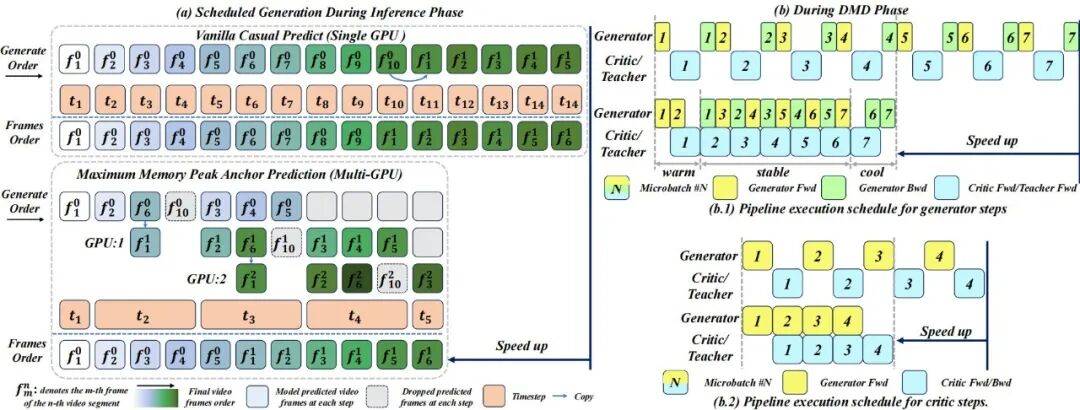 研究团队设计了一种新颖的流水线训练调度方案,通过重叠生成器、判别器与教师模型的计算过程,从而最小化 GPU 空闲时间(即流水线气泡)。生成器与判别器步骤的执行调度如图 3 所示。