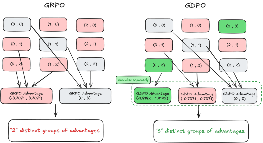 图2 在包含两个二元奖励、两个 rollout 的示例中,GRPO 与 GDPO 的优势值计算对比