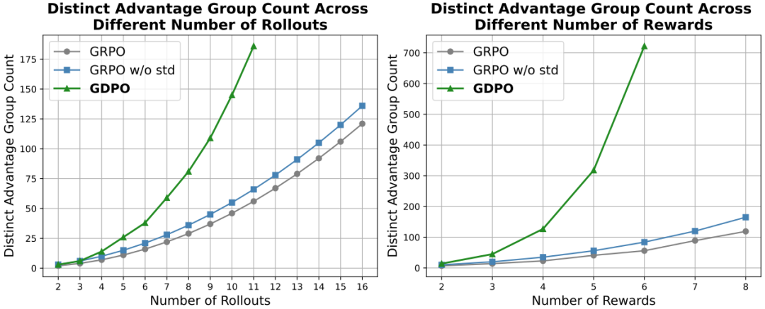 图4 不同方法生成的互异优势值组数量对比。随着 rollout 数量(左)或奖励维度数(右)增加,GDPO 始终显著优于 GRPO 及其变体(GRPO w/o std),保留更多优势值区分度,从而提供更具表达力的训练信号