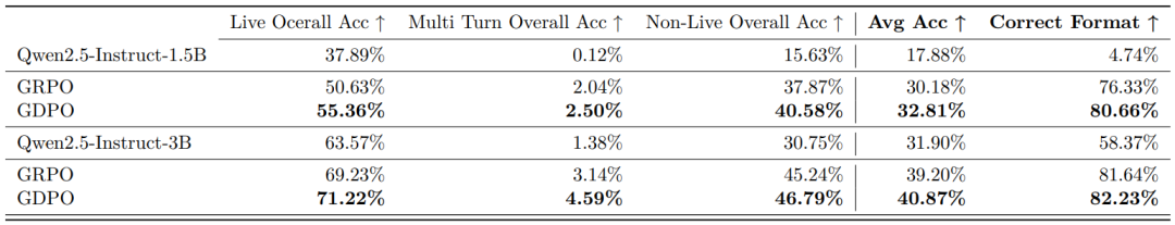 表1 利用GDPO 与 GRPO 训练的 Qwen2.5-Instruct-1.5B/3B 模型在工具调用准确率与格式正确性对比