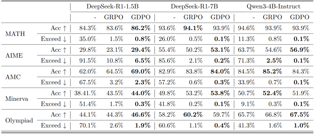 表4 在数学推理基准上,采用与未采用条件化长度奖励GRPO 与 GDPO 训练的 DeepSeek-R1-7B 模型对比
