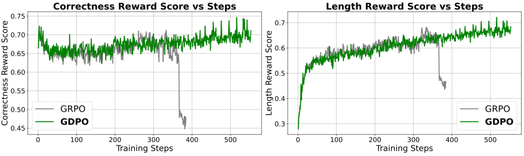 此外,从正确性奖励的轨迹来看,GDPO 能比 GRPO 更有效地恢复并提升正确性得分,在相同训练步数下取得更高的正确性表现。此外,GRPO 的训练在约 400 步后开始出现不稳定迹象,其正确性得分逐渐下降;而 GDPO 则持续提升正确性得分,展现出更强的优化能力和训练稳定性。