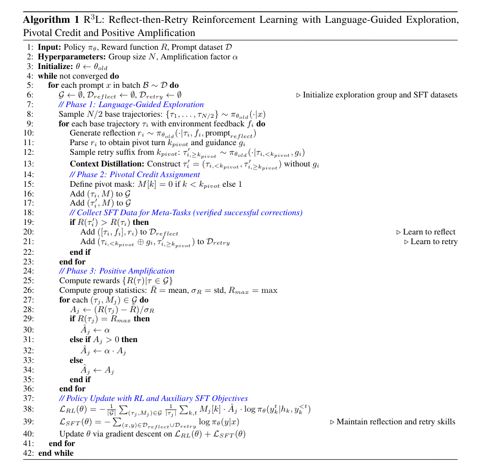 论文标题:R³L : Reflect-then-Retry Reinforcement Learning with Language-Guided Exploration, Pivotal Credit, and Positive Amplification