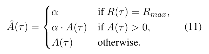 鉴于困难任务中失败样本占主导地位,且“反思-重试”会生成off-policy的数据,可能引发训练不稳定,R³L引入正向信号增强机制,只需引入统一的放大因子 α>1即可满足要求,轨迹优势定义为: