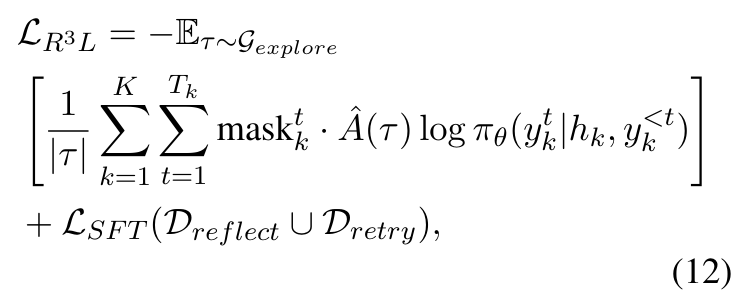 训练分组:数据集 Dbase和 Ddistill 组成用于强化学习优化的探索组Gexplore ,而 Dreflect 和 Dretry 则作为辅助的监督微调(SFT)目标,在整个训练过程中维持探索引擎。R³L将预算平均分配给基础轨迹与重试轨迹,从该组的所有样本中学习,并通过辅助任务显式维持反思与重试能力。