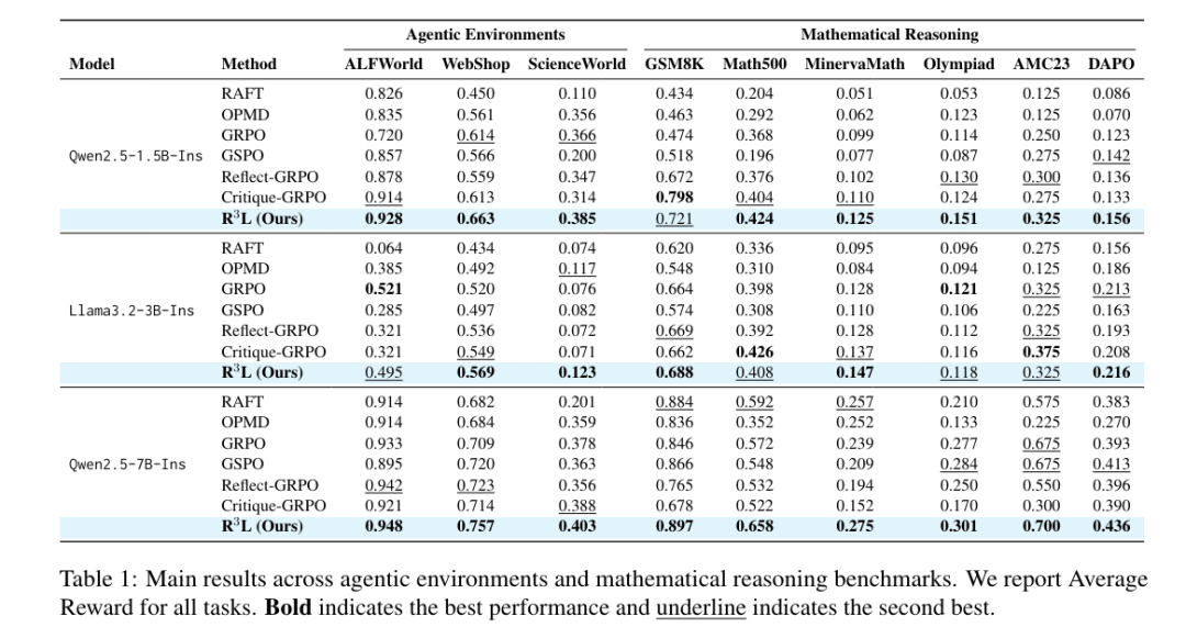 表1展示了R³L与不同强化学习方法,在智能体环境和数学推理基准上的评估结果。