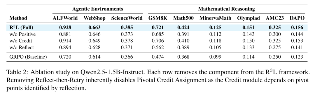 在智能体环境中,R³L 在 9 项设置中 8 项排名第一。使用1.5B模型时,在ALFWorld、WebShop 和 ScienceWorld 上分别达到 0.928、0.663 和 0.385。其提升在 WebShop 和 ScienceWorld 上尤为显著,分别超越最强基线 8.0% 和 5.2%,这得益于关键点信用分配有效保护了正确前缀免受后续错误的惩罚。