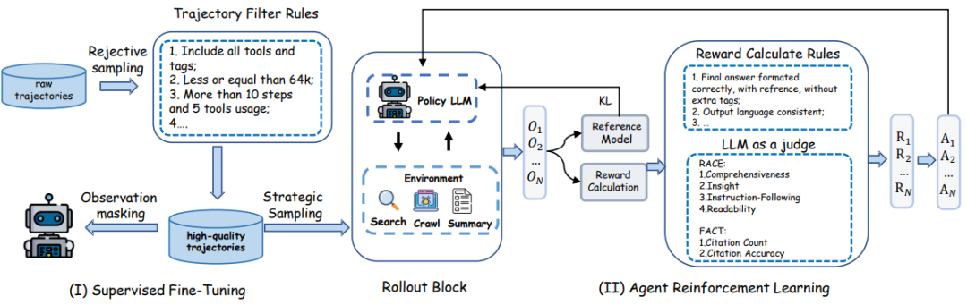 质量保证流程:为确保生成高保真训练数据,研究团队设计了全面的多阶段拒绝采样流水线。该流程从为每个查询生成三个不同的候选轨迹开始,然后进行基于规则的硬拒绝检查,包括完整性、上下文长度(≤64k tokens)、复杂性阈值(≥10推理步和5个不同工具使用动作)和一致性。通过确定性检查的轨迹继续进行基于Qwen3的LLM-as-a-Judge语义评估,最后进行主题分层的人工抽查作为最终验证层。