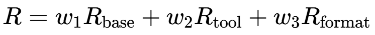 奖励函数设计:研究团队的奖励函数旨在平衡报告质量、工具利用效率和格式合规性,公式化为三个主要组件的加权组合: