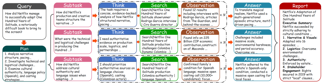 并行执行工作流:如图1所示,研究团队设计了一种并行执行工作流来生成研究报告,模拟研究团队中的严格分工。不同模型独立进行多轮工具集成推理,执行连续的"计划-执行-观察"循环以生成详细的子查询报告。这些中间报告随后由专用的总结器模型聚合形成最终答案。同时,所有子报告的基础轨迹被收集合并为单个SFT推理轨迹,确保训练数据捕捉到并行推理过程的全部深度。