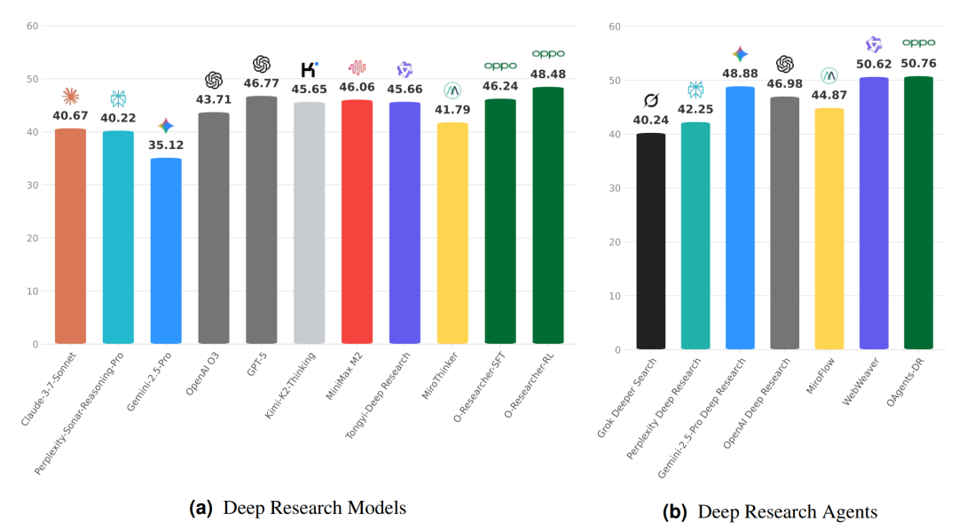 为此,OPPO AI Agent团队提出O-Researcher框架,利用Open Ended的特性,通过多智能体驱动的端到端深度研究数据合成,结合创新的两阶段训练策略,使开源模型无需依赖专有数据或模型,在主流深度研究基准上实现新的SOTA性能。该研究为开源大型语言模型的发展提供了一条可扩展且有效的路径,无需依赖专有数据或模型。