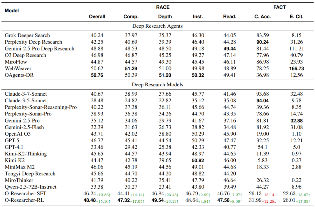 如图4所示,O-Researcher在包含100个doctoral-level研究任务的DeepResearch Bench上,实现了开源模型的新SOTA性能。