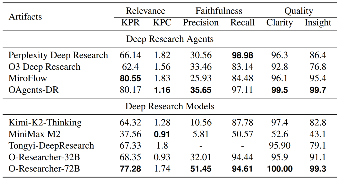 O-Researcher-72B在开源模型中实现 SOTA,且与闭源商业智能体竞争力极强;O-Researcher-72B在清晰度(100.00)和洞察力(99.3)上取得近乎完美分数,引用精度51.45为全类别最高,在保持高召回率的同时避免了幻觉引用。这证明了两阶段训练策略(SFT+RLAIF)有效平衡了模型的分析深度与事实严谨性,使开源模型在深度研究任务上实现突破性进展。