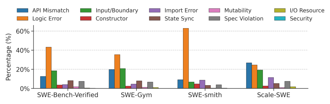 正如下图所示,相比真实场景,合成数据集(如SWE-smith)的任务大都局限在简单的逻辑错误(Logic Error)层面。反观 Scale-SWE 这类真实数据集,其类别分布更加均衡且丰富,能够更贴切地还原真实世界中软件工程所面临的复杂挑战。
