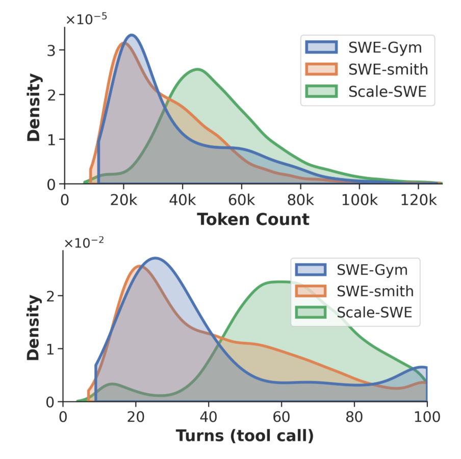 (注:蒸馏数据统计显示,在处理基于 Scale-SWE 的数据时,DeepSeek v3.2 需要消耗更多的对话轮次和 Token 数才能完成任务。这从侧面印证了Scale-SWE的问题描述并未发生答案泄露,保留了绝对的挑战性。)