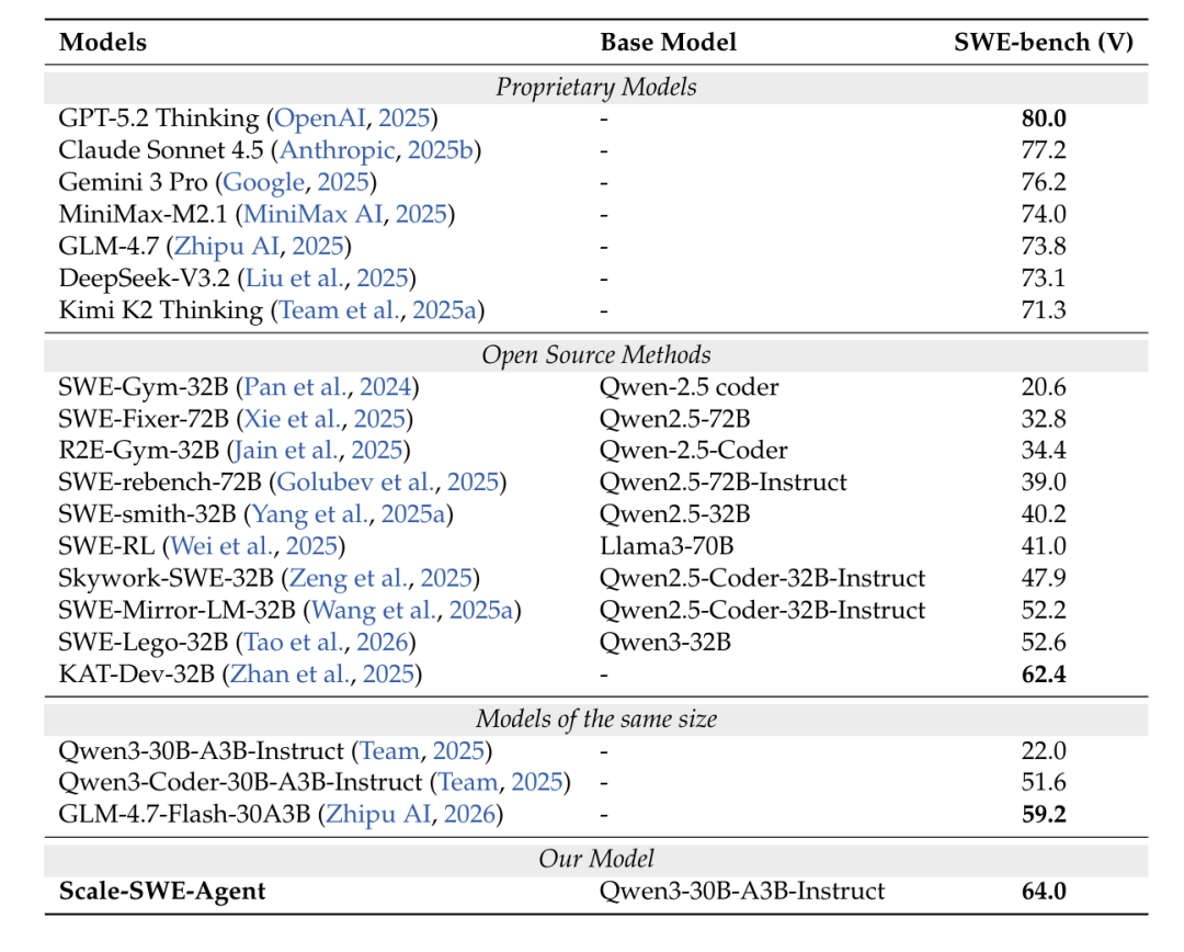 基于Scale-SWE 产出的蒸馏数据,团队对 Qwen3-30A3B-Instruct 模型进行了微调,并在极其严苛的 SWE-bench-Verified 评测集中斩获了 64% 的优异表现。这一结果有力地证明:同等参数量级的学术开源模型,完全有实力与 GLM-4.7-Flash 等前沿工业级大模型一较高下。