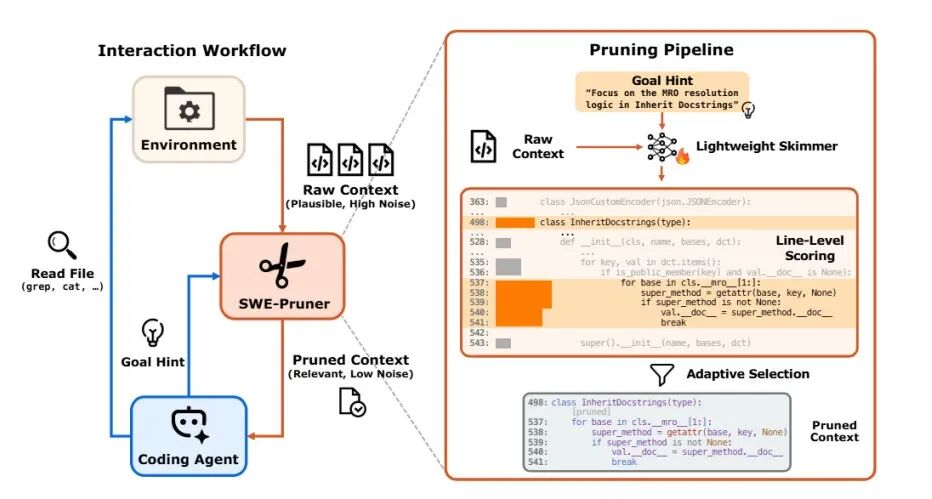 图3:SWE-Pruner 概览。左侧:交互工作流展示了 SWE-Pruner 作为编程智能体(Coding Agent)与环境之间的中间件运行。它拦截来自文件操作的原始上下文(Raw Context),并向智能体提供经过剪枝的上下文(Pruned Context)。右侧:剪枝流水线详细说明了其内部机制。根据编码智能体提供的特定目标提示(goal hint),神经速读模块(neural skimmer)对原始上下文进行逐行评分和自适应选择,从而生成并传递剪枝后的上下文。