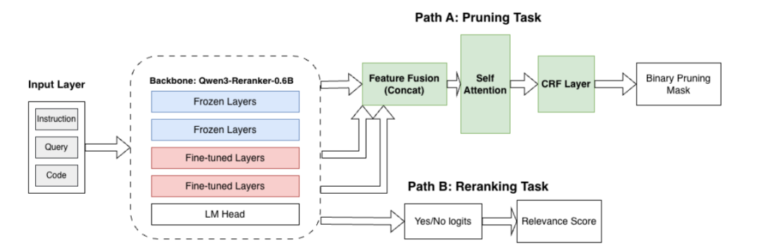 SWE-Pruner的核心是一个双头轻量模型(基于Qwen3-Reranker-0.6B):
