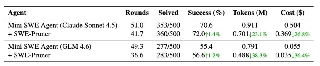 在SWE-Bench Verified(500个真实GitHub Issue修复任务)上,集成SWE-Pruner的Mini-SWE-Agent表现如下: