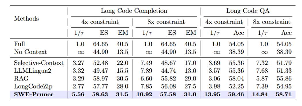 SWE-Pruner在更高的压缩率下相关指标也显著优于baseline方法——证明剪枝后上下文质量更高、更聚焦。