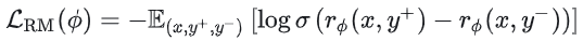 (1)第一步是训练奖励模型(RM):RM 的输入是一段文本(prompt+response),输出是一个标量分数。偏好数据通常是三元(x,y+,y−),表示同一个prompt,大家更喜欢y+这个答案,对于另一个答案偏好程度没有那么大。 常见的 RM 训练目标: