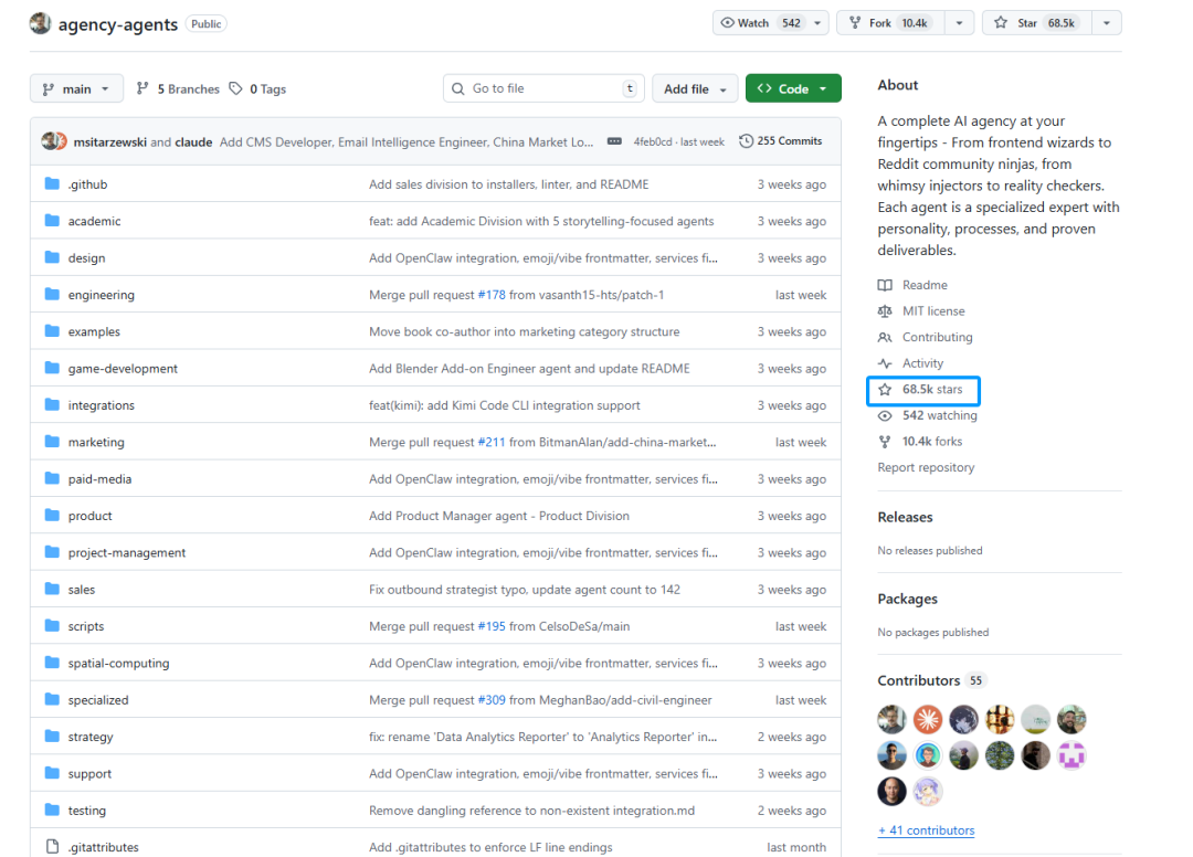 为此,今天要给大家介绍一个开源项目agency-agents,它不是一堆简单提示词,而是一套开箱即用的专业 AI 智能体库,内置12 大部门,共144个拥有明确身份定义、关键规则、工作流程和交付规范的专业智能体,支持Claude Code、OpenClaw、Cursor等主流AI编程工具。目前,该项目在github上已收获68.5k stars。