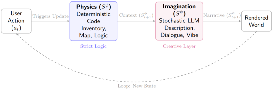 WWM将世界状态St分解为两个正交的组件: 。物理层(Sϕ)严格由确定性代码定义。它维护不变状态数据,如物品栏、坐标、资源上限,并强制执行逻辑一致性。想象层(Sψ)是随机且基于模型的。它生成高维感知内容,例如环境描述、NPC对话和美学风格。