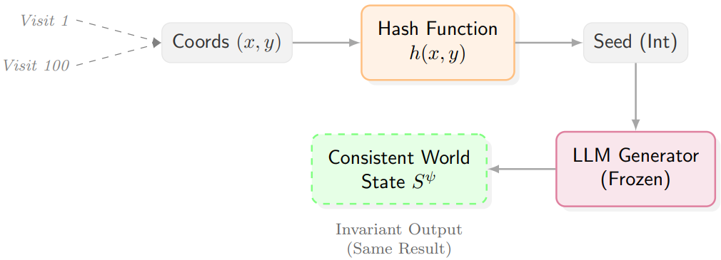 将一个无限宇宙存储在数据库中是不可行的,研究团队采用程序化生成的原则,按需生成世界。当用户到达位置 x时,系统跳过数据库查询,直接将该坐标传入一个哈希函数,得到一个种子h(x) 。该种子固定了大语言模型(LLM)的采样随机性。例如,用户可以离开一颗星球,稍后再返回,而星球依然保持不变。这实现了零存储成本的对象恒常性(Object Permanence):