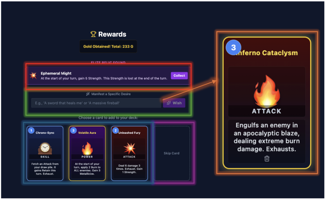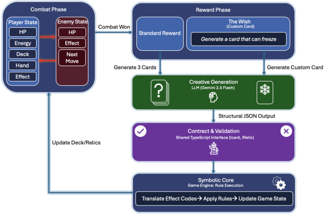 战斗系统基于客户端的 TypeScript/React 实现,可维护玩家与敌人的完整状态(生命值、能量、卡组与手牌、状态效果、敌人的行动意图) 。当玩家赢得战斗后,系统进入奖励阶段:可选择标准奖励(随机生成三张卡牌),或使用用户自定义的“愿望”来定制一张专属卡牌。 无论哪种方式,Gemini Flash 都作为受约束的内容设计师,输出一个结构化的 JSON 规格,包含卡牌名称、描述和效果代码。该输出会由一个基于 TypeScript 接口(如 ICard 和 IRelic)定义的契约与验证层进行严格校验。随后,符号化核心(symbolic core)将效果代码解析为游戏规则并执行,同步更新玩家的卡组或遗物库存,从而完成整个战斗循环,并为下一场战斗做好准备。