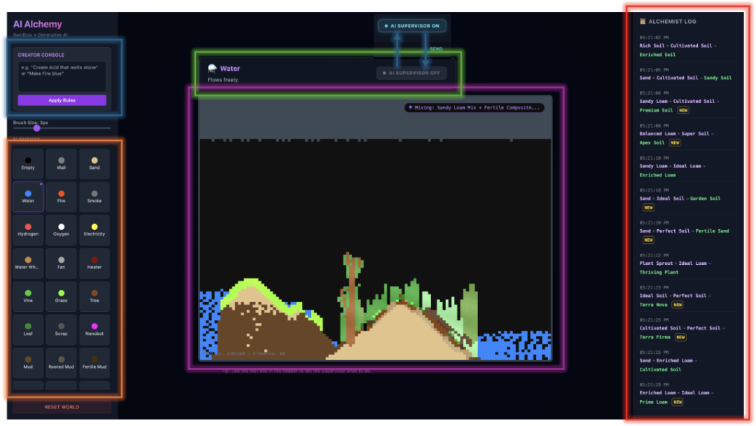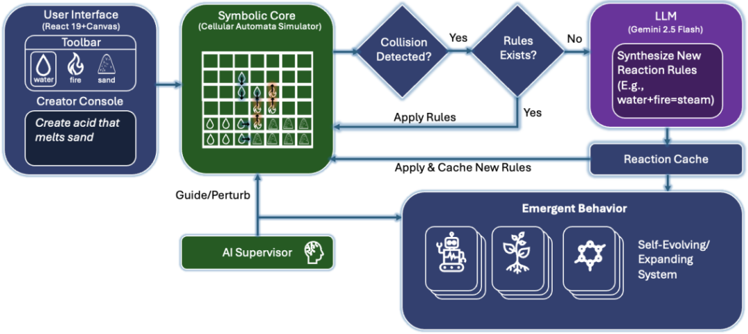 首先,将用户自定义的材料注入到一个符号化的元胞自动机(cellular-automata)“falling-sand”模拟器中。当粒子发生碰撞时,引擎优先应用已有的反应规则;若无匹配规则,则调用Gemini Flash生成一个符合预定义结构约束的反应结果,并立即将其缓存并集成到更新循环中。AI 监督器会持续监测画布状态,并对系统进行引导或扰动。