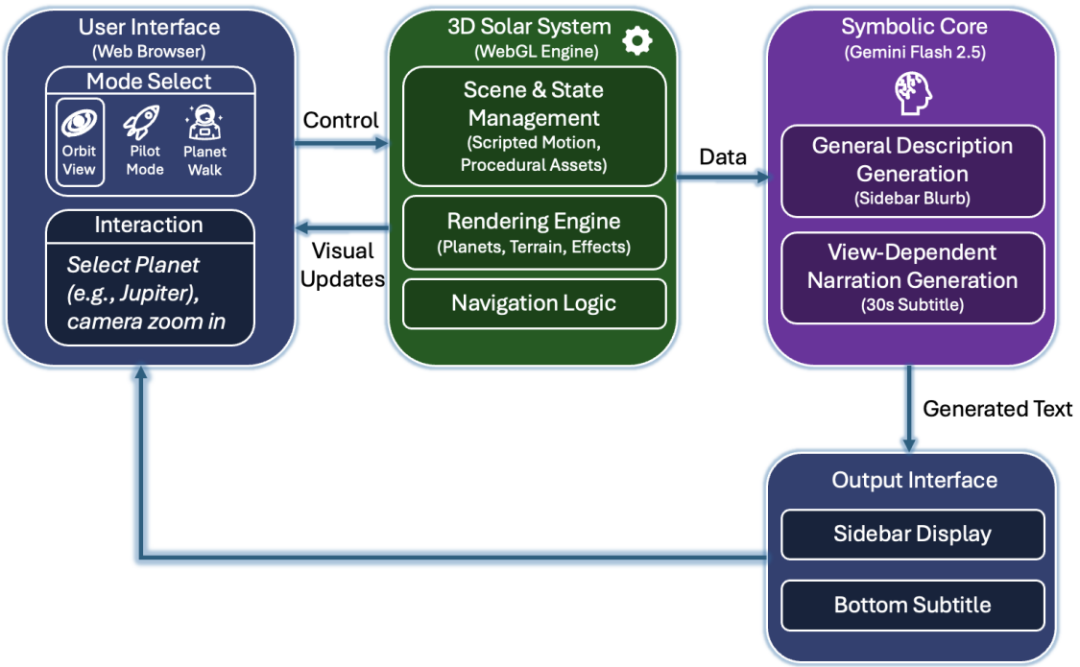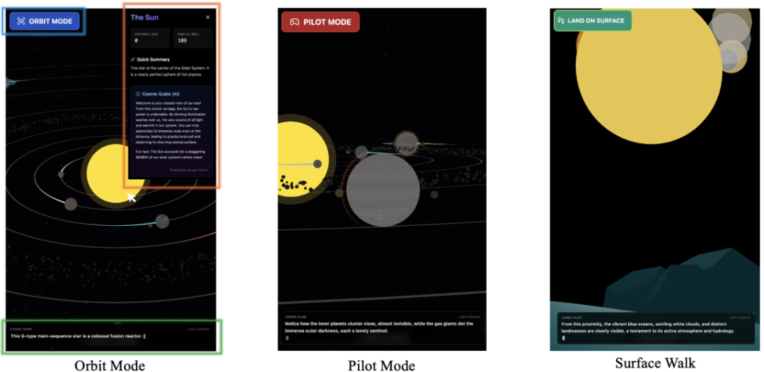 宇宙航行者是一个基于Web 世界模型的 3D 行星探索应用,构建了一个可交互、可导航的太阳系。它摒弃预渲染内容,转而通过空间上下文驱动 AI 导览:用户在轨道俯瞰、飞船驾驶和地表行走等模式间自由切换,系统则结合当前视角,每 30 秒由 Gemini 生成匹配的教育性解说(无网络时回退至本地描述)。场景布局由确定性代码控制(如固定轨道、程序化小行星),确保结构稳定;而 AI 仅负责上下文感知的叙述生成,当前版本覆盖太阳系主要天体,操作经过简化以提升可用性,未来可扩展至更真实物理、VR 或多人协作导览,展示了 WWM 在沉浸式科学教育中的潜力。